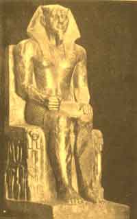Seven statues of Khafra were discovered by Mariette, so that his "Ka" was well provided for. The great diorite statue preserved in the Cairo museum is one of the enduring triumphs of Egyptian art. The conception is at once grand and imposing. His Majesty is seated on the throne, but he wears the wig of the great ruling judge. At the back of his head is the figure of the protecting Horus hawk. His face is calmer than Khufu's--resolution is combined with dignity and patience. He seems to be imbued with the spirit of Old Kingdom greatness.