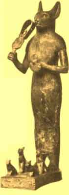 The goddess associated with Her-shef was Atet, who was also call Mersekhnet, a "Great Mother" deity similar to Hathor, Isis, Neith, and others. She was a cat goddess, and in her cat form was called Maau, an appropriate name. She slew the Apep serpent--a myth which, as we have seen, was absorbed by Ra. Other feline deities are Bast of Bubastis, Sekhet, wife of Ptah, and Tefnut. 2