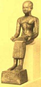 The excess of zeal displayed by the revivalists is illustrated in their deification of Imhotep, the learned architect of King Zoser of the Third Dynasty (see Chapter VIII). His memory had long been revered by the scribes; now he was exalted to a position not inferior to that held by Thoth in the time of Empire. As the son of Ptah, he was depicted as a young man wearing a tight-fitting cap, sitting with an open scroll upon his knees. He was reputed to cure diseases by the power of spells, and was a patron of learning, and he was a guide or priest of the dead, whom he cared for until they reached the Osirian Paradise. In Greek times he was called Imûthes, and identified with Asklepios.