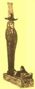 Painted and Gilded Figure of Ptah-Seker-Asar (Ptah-Sokar-Osiris) on a stand with a cavity containing a small portion of a body | the architect of the first Pyramid, who became a god in the Restoration Period and "son of Ptah or Ptah Osiris" Imhotep (Imuthes) (British Museum) |