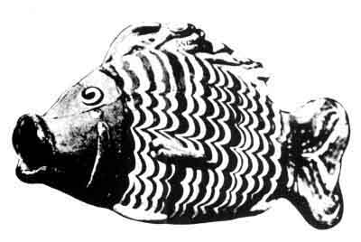 Variegated glass bottle in the form of a fish.